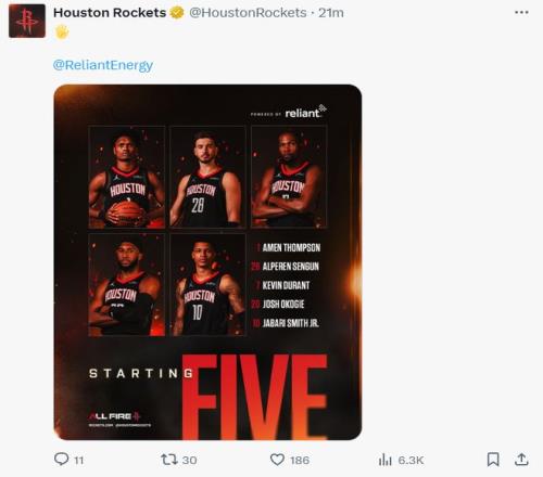 火箭:杜兰特19分6篮板(三节打卡),申京21分6篮板6助攻,阿门12分8助攻4篮板,小贾11分4篮板,奥科吉10分,谢泼德15分8助攻,伊森22分5篮板5助攻1盖帽0失误。