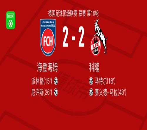 北京时间1月10日德国足球顶级联赛 联赛 第16轮,海登海姆主场对阵科隆。海登海姆派林格破门,尼许斯破门。科隆马特尔破门,赛义德-马拉破门。最终比分海登海姆 2-2 科隆。