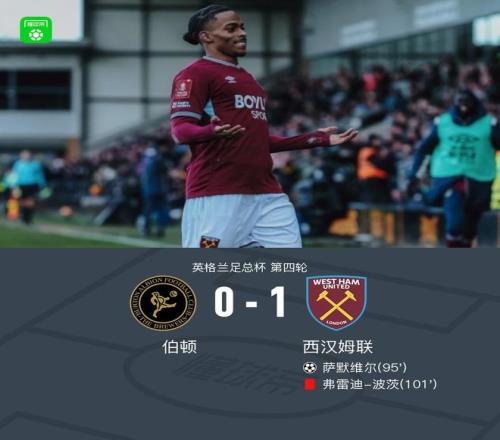 足总杯:西汉姆联10伯顿晋级,萨默维尔加时制胜,波茨染红