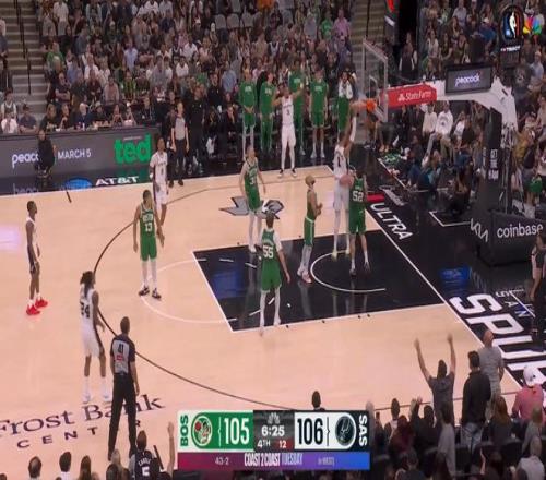 ——剩下41秒前,还是与文班亚马挡拆,强突凯尔特人三人防线,上篮打进,还造成犯规(加罚没进),这一球可以说杀死了比赛