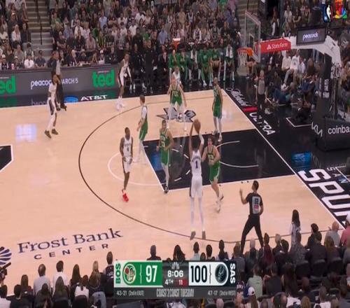 ——剩下1分25秒前,与文班亚马挡拆,突破吸引包夹,传球处于空位的卡斯尔,后者投进了一记价值连城的三分